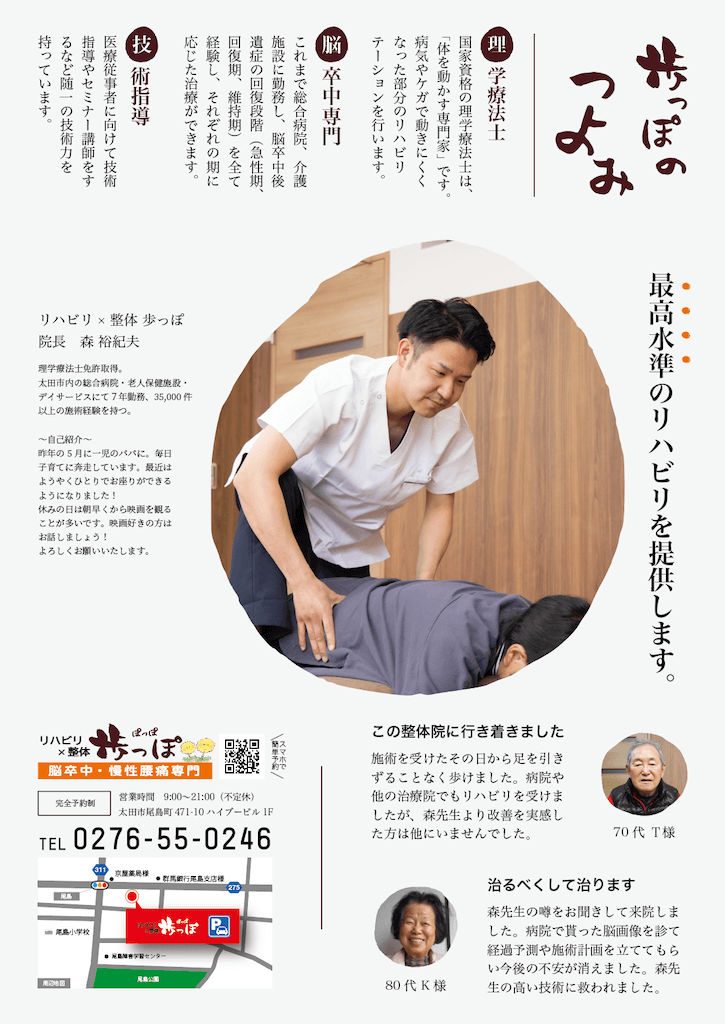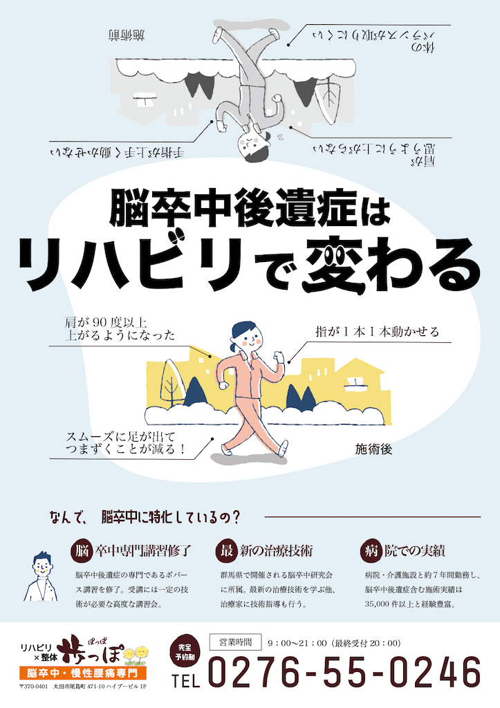 今回は脳卒中後遺症の方がターゲット。整体院といったら堅苦しいイメージがあるとのことで、柔らかいイメージのデザインに。