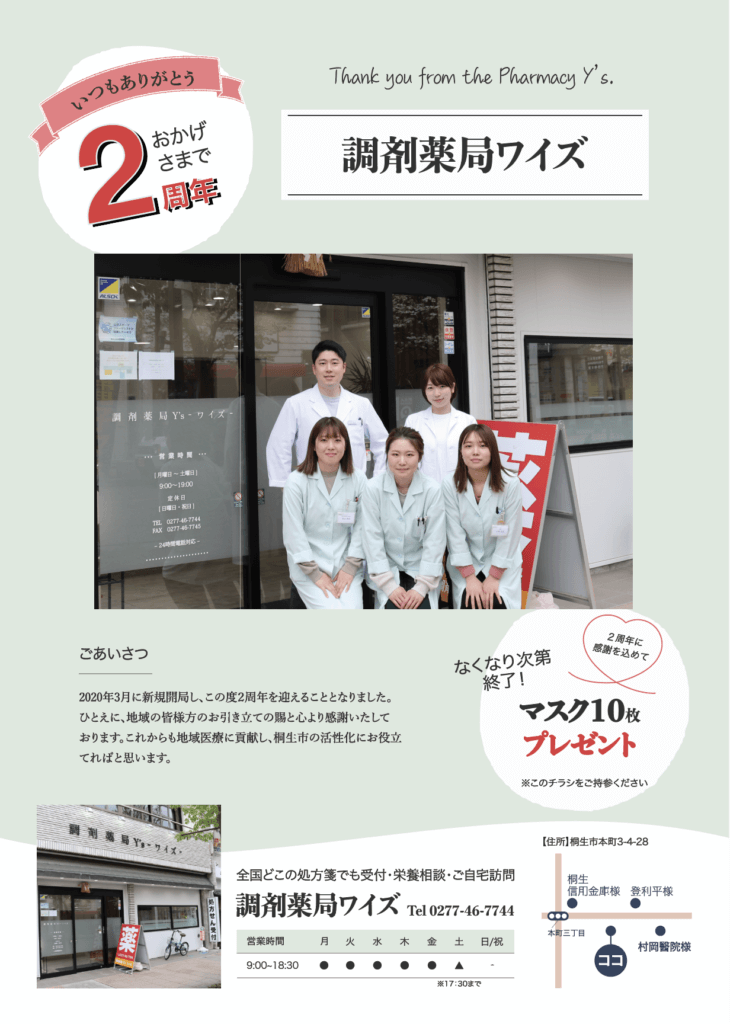 群馬県桐生市で経営している調剤薬局ワイズ。2周年ということで配布する記念チラシをご依頼いただきました。